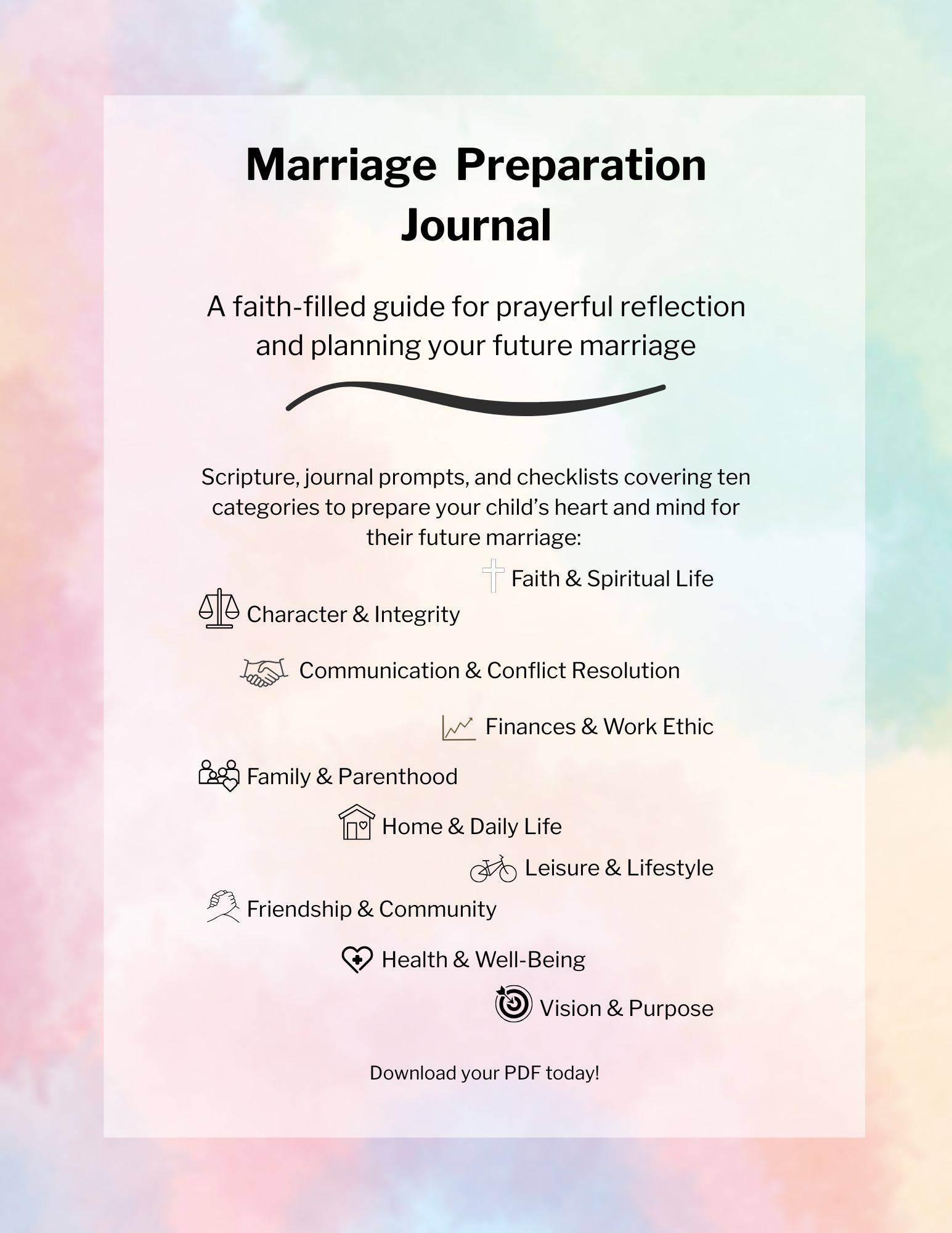 Give your teen or young adult the tools to grow in wisdom and faith as they think about marriage. This Scripture-based guide helps them explore ten key areas — including faith, character, finances, and family — with writing prompts, checklists, and reflective questions. It’s a gentle, faith-filled way to help your child prepare their heart to be the kind of spouse God calls them to be.